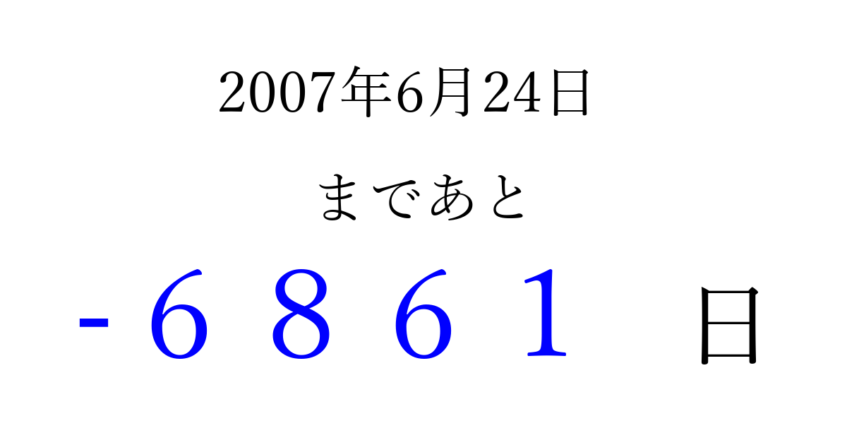 2007年6月24日(日)は もう 0000 日過ぎました 追加すると、トップページからすぐ選べるようになります ※2026/04/06現在の結果です。 最新の状態に更新する ↓シェアして、タイムライン上にカウントダウンを表示しよう!↓ 📤 この結果を共有する Tweet シェア Threads Bluesky 別の日付でカウントダウン 2007年6月のカレンダー このページをブックマークに追加すると、いつでもカウントダウンを確認できます。 (PC: Ctrl+D / Mac: ⌘+D) hitome-notes.comでは以下のページも運営しています。 指定日と期間から日付を計算 | ガチャ確率計算・シミュレーション | プライバシー・ポリシー 運営者:Avocado
