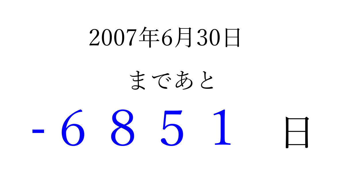 2007年6月30日(土)は もう 0000 日過ぎました 追加すると、トップページからすぐ選べるようになります ※2026/04/02現在の結果です。 最新の状態に更新する ↓シェアして、タイムライン上にカウントダウンを表示しよう!↓ 📤 この結果を共有する Tweet シェア Threads Bluesky 別の日付でカウントダウン 2007年6月のカレンダー このページをブックマークに追加すると、いつでもカウントダウンを確認できます。 (PC: Ctrl+D / Mac: ⌘+D) hitome-notes.comでは以下のページも運営しています。 指定日と期間から日付を計算 | ガチャ確率計算・シミュレーション | プライバシー・ポリシー 運営者:Avocado