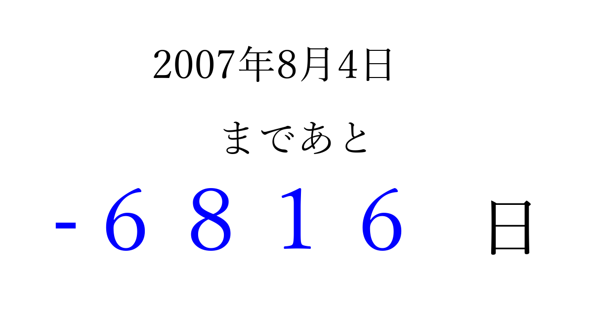 2007年8月4日(土)は もう 0000 日過ぎました 追加すると、トップページからすぐ選べるようになります ※2026/04/02現在の結果です。 最新の状態に更新する ↓シェアして、タイムライン上にカウントダウンを表示しよう!↓ 📤 この結果を共有する Tweet シェア Threads Bluesky 別の日付でカウントダウン 2007年8月のカレンダー このページをブックマークに追加すると、いつでもカウントダウンを確認できます。 (PC: Ctrl+D / Mac: ⌘+D) hitome-notes.comでは以下のページも運営しています。 指定日と期間から日付を計算 | ガチャ確率計算・シミュレーション | プライバシー・ポリシー 運営者:Avocado