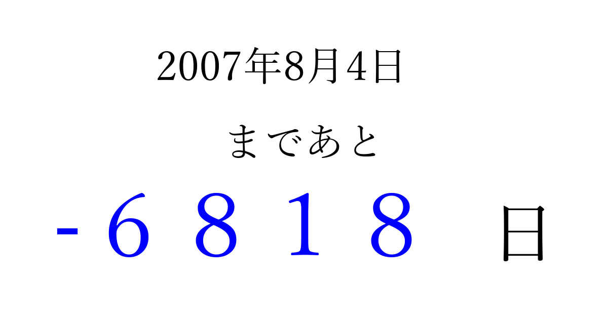 2007年8月4日(土)は もう 0000 日過ぎました 追加すると、トップページからすぐ選べるようになります ※2026/04/04現在の結果です。 最新の状態に更新する ↓シェアして、タイムライン上にカウントダウンを表示しよう!↓ 📤 この結果を共有する Tweet シェア Threads Bluesky 別の日付でカウントダウン 2007年8月のカレンダー このページをブックマークに追加すると、いつでもカウントダウンを確認できます。 (PC: Ctrl+D / Mac: ⌘+D) hitome-notes.comでは以下のページも運営しています。 指定日と期間から日付を計算 | ガチャ確率計算・シミュレーション | プライバシー・ポリシー 運営者:Avocado