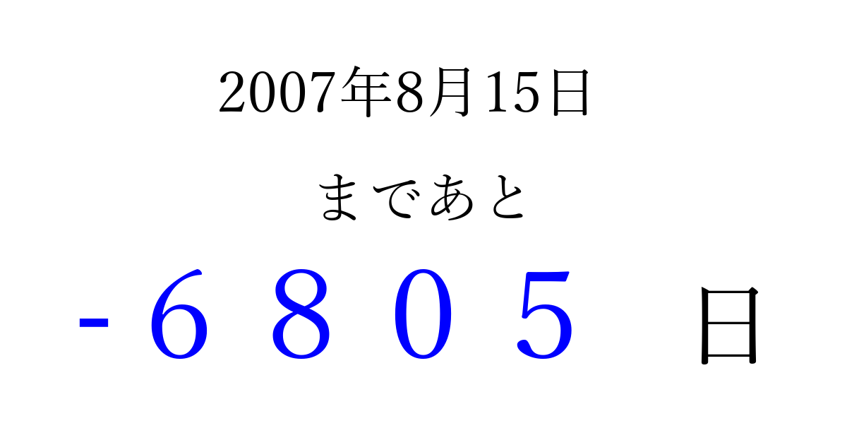 2007年8月15日(水)は もう 0000 日過ぎました 追加すると、トップページからすぐ選べるようになります ※2026/04/02現在の結果です。 最新の状態に更新する ↓シェアして、タイムライン上にカウントダウンを表示しよう!↓ 📤 この結果を共有する Tweet シェア Threads Bluesky 別の日付でカウントダウン 2007年8月のカレンダー このページをブックマークに追加すると、いつでもカウントダウンを確認できます。 (PC: Ctrl+D / Mac: ⌘+D) hitome-notes.comでは以下のページも運営しています。 指定日と期間から日付を計算 | ガチャ確率計算・シミュレーション | プライバシー・ポリシー 運営者:Avocado