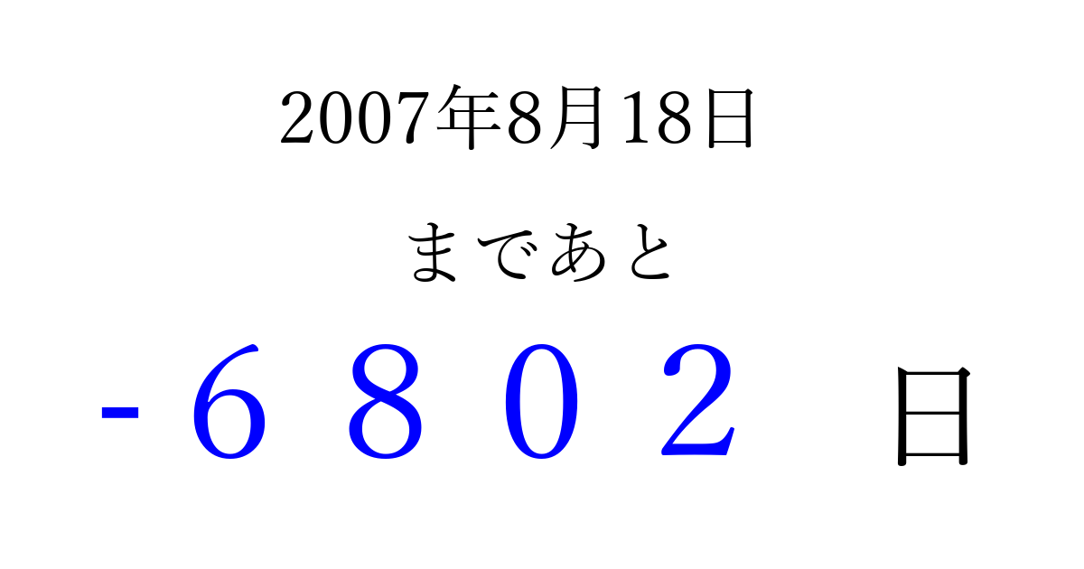 2007年8月18日(土)は もう 0000 日過ぎました 追加すると、トップページからすぐ選べるようになります ※2026/04/02現在の結果です。 最新の状態に更新する ↓シェアして、タイムライン上にカウントダウンを表示しよう!↓ 📤 この結果を共有する Tweet シェア Threads Bluesky 別の日付でカウントダウン 2007年8月のカレンダー このページをブックマークに追加すると、いつでもカウントダウンを確認できます。 (PC: Ctrl+D / Mac: ⌘+D) hitome-notes.comでは以下のページも運営しています。 指定日と期間から日付を計算 | ガチャ確率計算・シミュレーション | プライバシー・ポリシー 運営者:Avocado