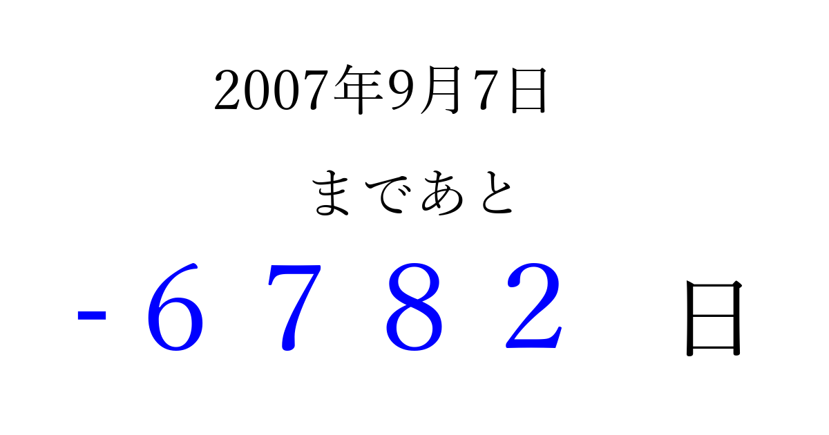 2007年9月7日(金)は もう 0000 日過ぎました 追加すると、トップページからすぐ選べるようになります ※2026/04/02現在の結果です。 最新の状態に更新する ↓シェアして、タイムライン上にカウントダウンを表示しよう!↓ 📤 この結果を共有する Tweet シェア Threads Bluesky 別の日付でカウントダウン 2007年9月のカレンダー このページをブックマークに追加すると、いつでもカウントダウンを確認できます。 (PC: Ctrl+D / Mac: ⌘+D) hitome-notes.comでは以下のページも運営しています。 指定日と期間から日付を計算 | ガチャ確率計算・シミュレーション | プライバシー・ポリシー 運営者:Avocado