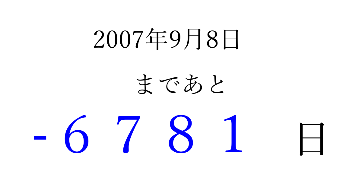 2007年9月8日(土)は もう 0000 日過ぎました 追加すると、トップページからすぐ選べるようになります ※2026/04/02現在の結果です。 最新の状態に更新する ↓シェアして、タイムライン上にカウントダウンを表示しよう!↓ 📤 この結果を共有する Tweet シェア Threads Bluesky 別の日付でカウントダウン 2007年9月のカレンダー このページをブックマークに追加すると、いつでもカウントダウンを確認できます。 (PC: Ctrl+D / Mac: ⌘+D) hitome-notes.comでは以下のページも運営しています。 指定日と期間から日付を計算 | ガチャ確率計算・シミュレーション | プライバシー・ポリシー 運営者:Avocado