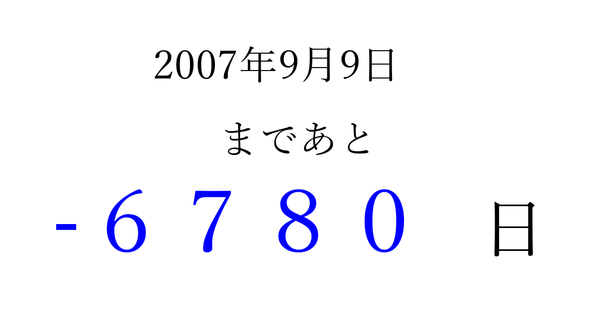 2007年9月9日(日)は もう 0000 日過ぎました 追加すると、トップページからすぐ選べるようになります ※2026/04/02現在の結果です。 最新の状態に更新する ↓シェアして、タイムライン上にカウントダウンを表示しよう!↓ 📤 この結果を共有する Tweet シェア Threads Bluesky 別の日付でカウントダウン 2007年9月のカレンダー このページをブックマークに追加すると、いつでもカウントダウンを確認できます。 (PC: Ctrl+D / Mac: ⌘+D) hitome-notes.comでは以下のページも運営しています。 指定日と期間から日付を計算 | ガチャ確率計算・シミュレーション | プライバシー・ポリシー 運営者:Avocado