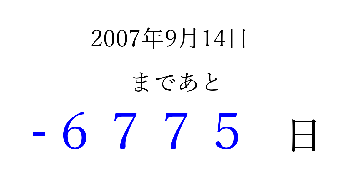 2007年9月14日(金)は もう 0000 日過ぎました 追加すると、トップページからすぐ選べるようになります ※2026/04/02現在の結果です。 最新の状態に更新する ↓シェアして、タイムライン上にカウントダウンを表示しよう!↓ 📤 この結果を共有する Tweet シェア Threads Bluesky 別の日付でカウントダウン 2007年9月のカレンダー このページをブックマークに追加すると、いつでもカウントダウンを確認できます。 (PC: Ctrl+D / Mac: ⌘+D) hitome-notes.comでは以下のページも運営しています。 指定日と期間から日付を計算 | ガチャ確率計算・シミュレーション | プライバシー・ポリシー 運営者:Avocado