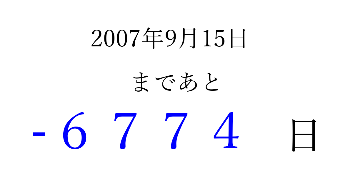 2007年9月15日(土)は もう 0000 日過ぎました 追加すると、トップページからすぐ選べるようになります ※2026/04/02現在の結果です。 最新の状態に更新する ↓シェアして、タイムライン上にカウントダウンを表示しよう!↓ 📤 この結果を共有する Tweet シェア Threads Bluesky 別の日付でカウントダウン 2007年9月のカレンダー このページをブックマークに追加すると、いつでもカウントダウンを確認できます。 (PC: Ctrl+D / Mac: ⌘+D) hitome-notes.comでは以下のページも運営しています。 指定日と期間から日付を計算 | ガチャ確率計算・シミュレーション | プライバシー・ポリシー 運営者:Avocado
