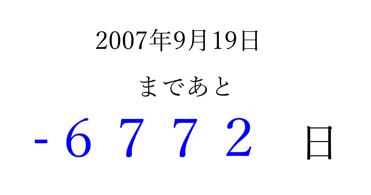 2007年9月19日(水)は もう 0000 日過ぎました 追加すると、トップページからすぐ選べるようになります ※2026/04/04現在の結果です。 最新の状態に更新する ↓シェアして、タイムライン上にカウントダウンを表示しよう!↓ 📤 この結果を共有する Tweet シェア Threads Bluesky 別の日付でカウントダウン 2007年9月のカレンダー このページをブックマークに追加すると、いつでもカウントダウンを確認できます。 (PC: Ctrl+D / Mac: ⌘+D) hitome-notes.comでは以下のページも運営しています。 指定日と期間から日付を計算 | ガチャ確率計算・シミュレーション | プライバシー・ポリシー 運営者:Avocado