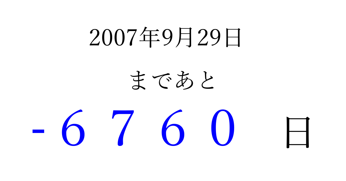 2007年9月29日(土)は もう 0000 日過ぎました 追加すると、トップページからすぐ選べるようになります ※2026/04/02現在の結果です。 最新の状態に更新する ↓シェアして、タイムライン上にカウントダウンを表示しよう!↓ 📤 この結果を共有する Tweet シェア Threads Bluesky 別の日付でカウントダウン 2007年9月のカレンダー このページをブックマークに追加すると、いつでもカウントダウンを確認できます。 (PC: Ctrl+D / Mac: ⌘+D) hitome-notes.comでは以下のページも運営しています。 指定日と期間から日付を計算 | ガチャ確率計算・シミュレーション | プライバシー・ポリシー 運営者:Avocado