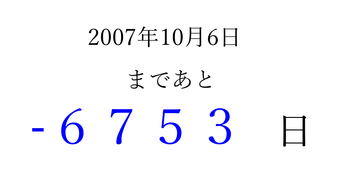 2007年10月6日(土)は もう 0000 日過ぎました 追加すると、トップページからすぐ選べるようになります ※2026/04/02現在の結果です。 最新の状態に更新する ↓シェアして、タイムライン上にカウントダウンを表示しよう!↓ 📤 この結果を共有する Tweet シェア Threads Bluesky 別の日付でカウントダウン 2007年10月のカレンダー このページをブックマークに追加すると、いつでもカウントダウンを確認できます。 (PC: Ctrl+D / Mac: ⌘+D) hitome-notes.comでは以下のページも運営しています。 指定日と期間から日付を計算 | ガチャ確率計算・シミュレーション | プライバシー・ポリシー 運営者:Avocado