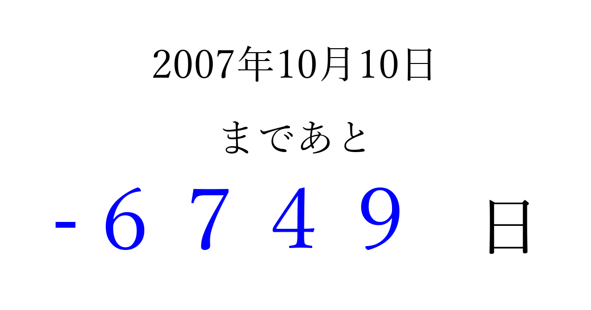 2007年10月10日(水)は もう 0000 日過ぎました 追加すると、トップページからすぐ選べるようになります ※2026/04/02現在の結果です。 最新の状態に更新する ↓シェアして、タイムライン上にカウントダウンを表示しよう!↓ 📤 この結果を共有する Tweet シェア Threads Bluesky 別の日付でカウントダウン 2007年10月のカレンダー このページをブックマークに追加すると、いつでもカウントダウンを確認できます。 (PC: Ctrl+D / Mac: ⌘+D) hitome-notes.comでは以下のページも運営しています。 指定日と期間から日付を計算 | ガチャ確率計算・シミュレーション | プライバシー・ポリシー 運営者:Avocado