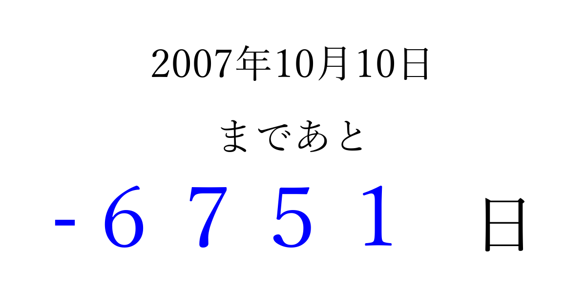 2007年10月10日(水)は もう 0000 日過ぎました 追加すると、トップページからすぐ選べるようになります ※2026/04/04現在の結果です。 最新の状態に更新する ↓シェアして、タイムライン上にカウントダウンを表示しよう!↓ 📤 この結果を共有する Tweet シェア Threads Bluesky 別の日付でカウントダウン 2007年10月のカレンダー このページをブックマークに追加すると、いつでもカウントダウンを確認できます。 (PC: Ctrl+D / Mac: ⌘+D) hitome-notes.comでは以下のページも運営しています。 指定日と期間から日付を計算 | ガチャ確率計算・シミュレーション | プライバシー・ポリシー 運営者:Avocado