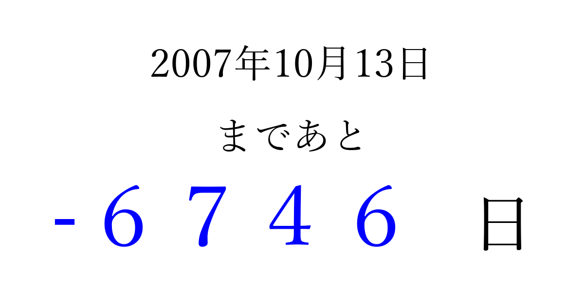 2007年10月13日(土)は もう 0000 日過ぎました 追加すると、トップページからすぐ選べるようになります ※2026/04/02現在の結果です。 最新の状態に更新する ↓シェアして、タイムライン上にカウントダウンを表示しよう!↓ 📤 この結果を共有する Tweet シェア Threads Bluesky 別の日付でカウントダウン 2007年10月のカレンダー このページをブックマークに追加すると、いつでもカウントダウンを確認できます。 (PC: Ctrl+D / Mac: ⌘+D) hitome-notes.comでは以下のページも運営しています。 指定日と期間から日付を計算 | ガチャ確率計算・シミュレーション | プライバシー・ポリシー 運営者:Avocado
