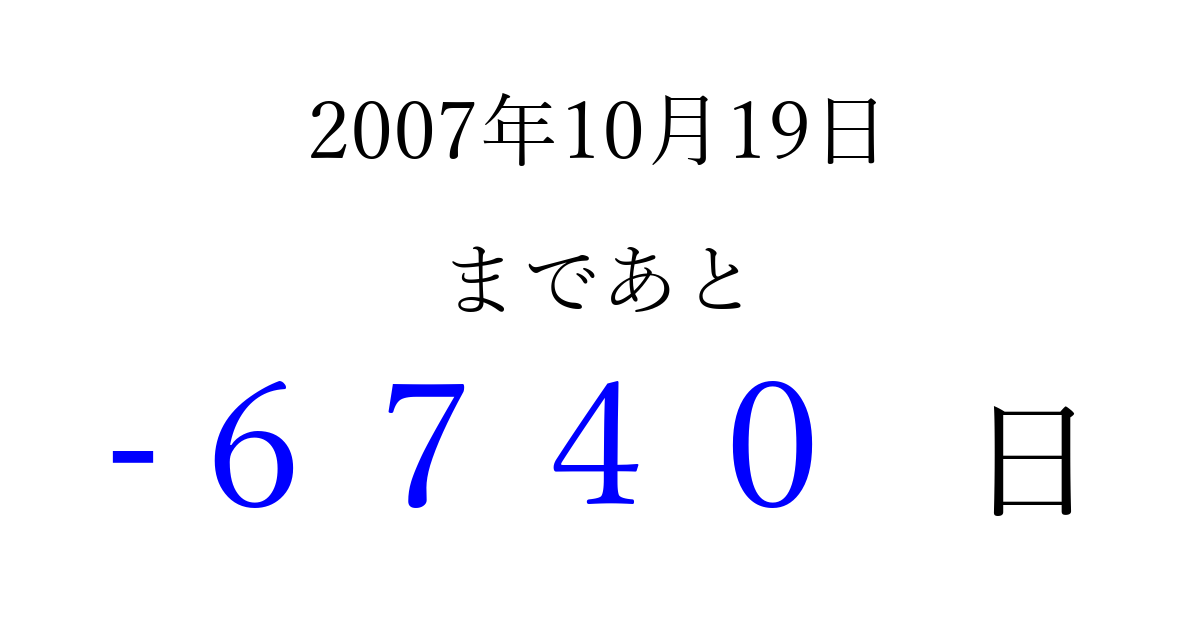 2007年10月19日(金)は もう 0000 日過ぎました 追加すると、トップページからすぐ選べるようになります ※2026/04/02現在の結果です。 最新の状態に更新する ↓シェアして、タイムライン上にカウントダウンを表示しよう!↓ 📤 この結果を共有する Tweet シェア Threads Bluesky 別の日付でカウントダウン 2007年10月のカレンダー このページをブックマークに追加すると、いつでもカウントダウンを確認できます。 (PC: Ctrl+D / Mac: ⌘+D) hitome-notes.comでは以下のページも運営しています。 指定日と期間から日付を計算 | ガチャ確率計算・シミュレーション | プライバシー・ポリシー 運営者:Avocado