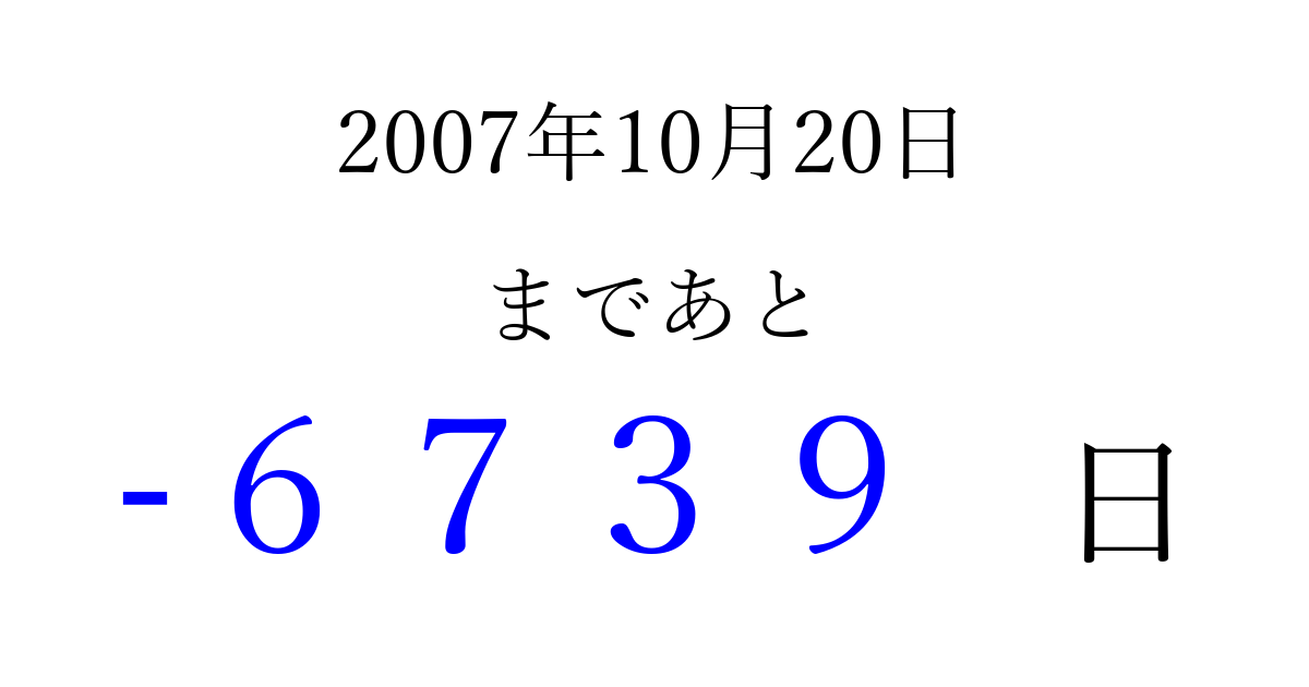 2007年10月20日(土)は もう 0000 日過ぎました 追加すると、トップページからすぐ選べるようになります ※2026/04/02現在の結果です。 最新の状態に更新する ↓シェアして、タイムライン上にカウントダウンを表示しよう!↓ 📤 この結果を共有する Tweet シェア Threads Bluesky 別の日付でカウントダウン 2007年10月のカレンダー このページをブックマークに追加すると、いつでもカウントダウンを確認できます。 (PC: Ctrl+D / Mac: ⌘+D) hitome-notes.comでは以下のページも運営しています。 指定日と期間から日付を計算 | ガチャ確率計算・シミュレーション | プライバシー・ポリシー 運営者:Avocado