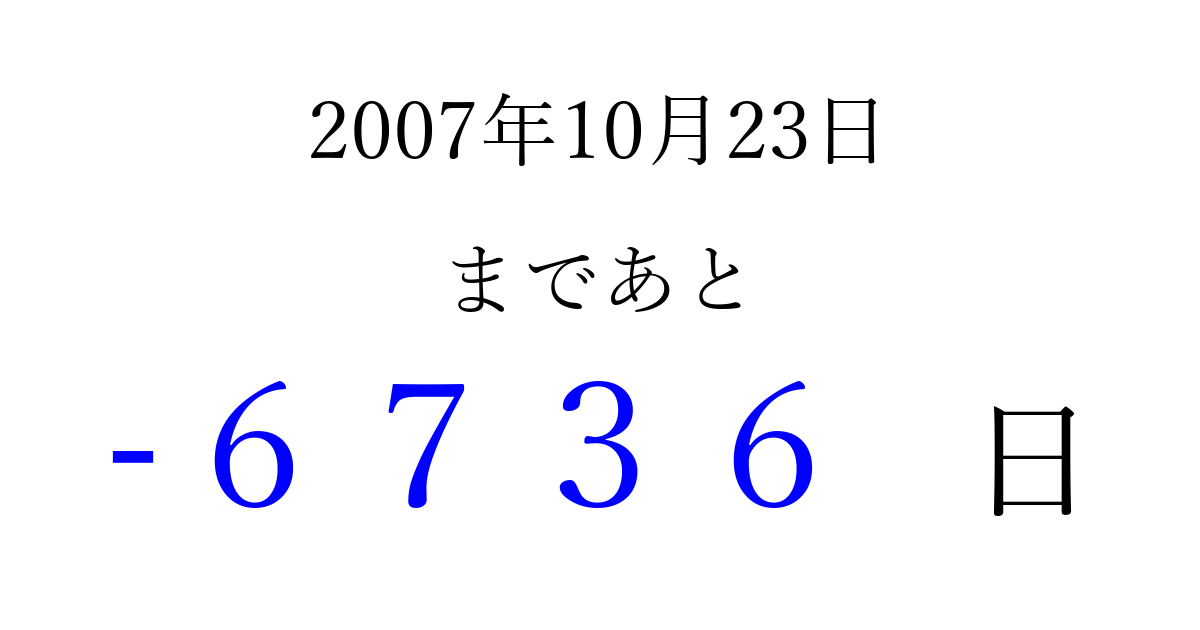 2007年10月23日(火)は もう 0000 日過ぎました 追加すると、トップページからすぐ選べるようになります ※2026/04/02現在の結果です。 最新の状態に更新する ↓シェアして、タイムライン上にカウントダウンを表示しよう!↓ 📤 この結果を共有する Tweet シェア Threads Bluesky 別の日付でカウントダウン 2007年10月のカレンダー このページをブックマークに追加すると、いつでもカウントダウンを確認できます。 (PC: Ctrl+D / Mac: ⌘+D) hitome-notes.comでは以下のページも運営しています。 指定日と期間から日付を計算 | ガチャ確率計算・シミュレーション | プライバシー・ポリシー 運営者:Avocado