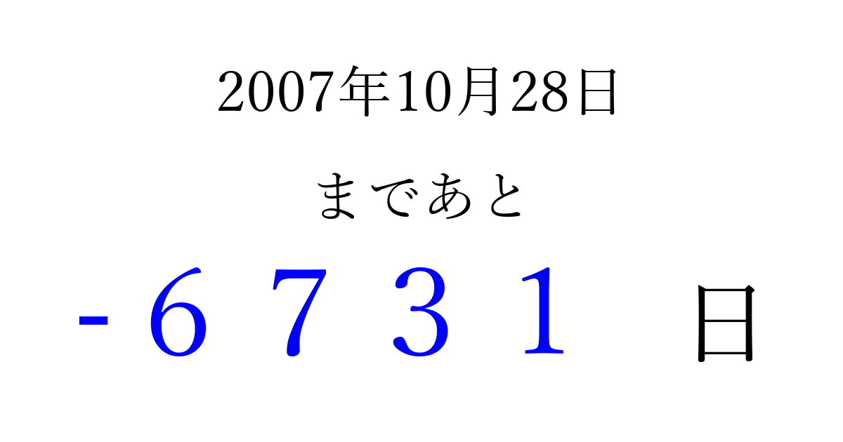 2007年10月28日(日)は もう 0000 日過ぎました 追加すると、トップページからすぐ選べるようになります ※2026/04/02現在の結果です。 最新の状態に更新する ↓シェアして、タイムライン上にカウントダウンを表示しよう!↓ 📤 この結果を共有する Tweet シェア Threads Bluesky 別の日付でカウントダウン 2007年10月のカレンダー このページをブックマークに追加すると、いつでもカウントダウンを確認できます。 (PC: Ctrl+D / Mac: ⌘+D) hitome-notes.comでは以下のページも運営しています。 指定日と期間から日付を計算 | ガチャ確率計算・シミュレーション | プライバシー・ポリシー 運営者:Avocado