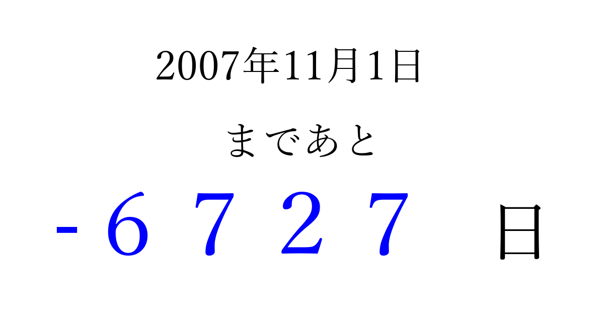 2007年11月1日(木)は もう 0000 日過ぎました 追加すると、トップページからすぐ選べるようになります ※2026/04/02現在の結果です。 最新の状態に更新する ↓シェアして、タイムライン上にカウントダウンを表示しよう!↓ 📤 この結果を共有する Tweet シェア Threads Bluesky 別の日付でカウントダウン 2007年11月のカレンダー このページをブックマークに追加すると、いつでもカウントダウンを確認できます。 (PC: Ctrl+D / Mac: ⌘+D) hitome-notes.comでは以下のページも運営しています。 指定日と期間から日付を計算 | ガチャ確率計算・シミュレーション | プライバシー・ポリシー 運営者:Avocado