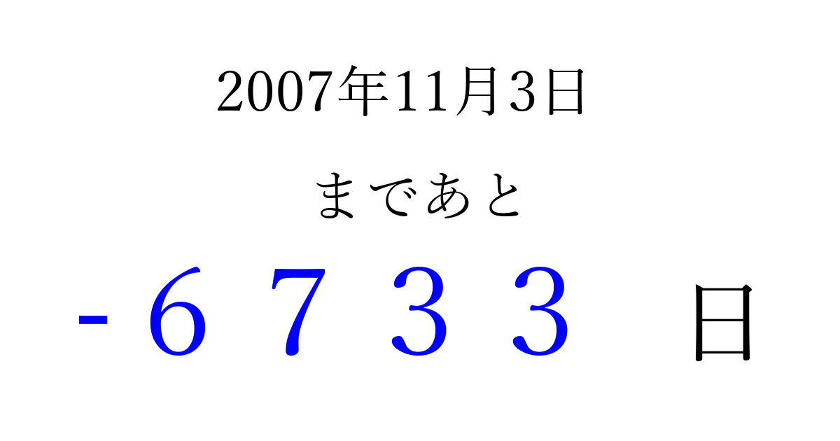 2007年11月3日(土)は もう 0000 日過ぎました 追加すると、トップページからすぐ選べるようになります ※2026/04/10現在の結果です。 最新の状態に更新する ↓シェアして、タイムライン上にカウントダウンを表示しよう!↓ 📤 この結果を共有する Tweet シェア Threads Bluesky 別の日付でカウントダウン 2007年11月のカレンダー このページをブックマークに追加すると、いつでもカウントダウンを確認できます。 (PC: Ctrl+D / Mac: ⌘+D) hitome-notes.comでは以下のページも運営しています。 指定日と期間から日付を計算 | ガチャ確率計算・シミュレーション | プライバシー・ポリシー 運営者:Avocado