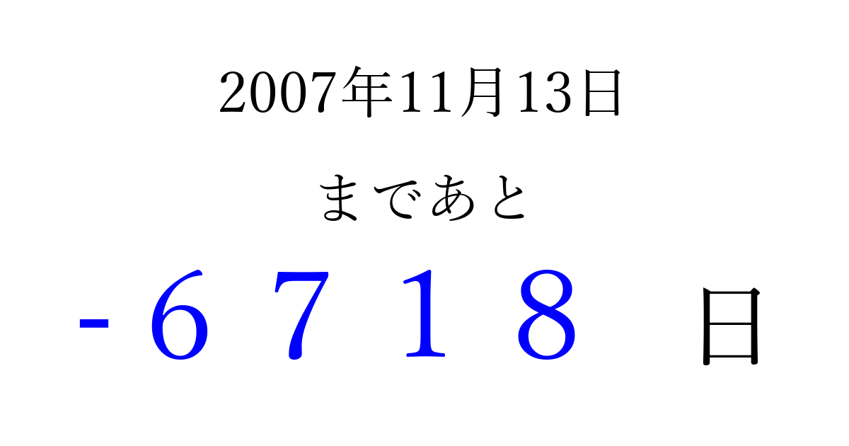 2007年11月13日(火)は もう 0000 日過ぎました 追加すると、トップページからすぐ選べるようになります ※2026/04/05現在の結果です。 最新の状態に更新する ↓シェアして、タイムライン上にカウントダウンを表示しよう!↓ 📤 この結果を共有する Tweet シェア Threads Bluesky 別の日付でカウントダウン 2007年11月のカレンダー このページをブックマークに追加すると、いつでもカウントダウンを確認できます。 (PC: Ctrl+D / Mac: ⌘+D) hitome-notes.comでは以下のページも運営しています。 指定日と期間から日付を計算 | ガチャ確率計算・シミュレーション | プライバシー・ポリシー 運営者:Avocado