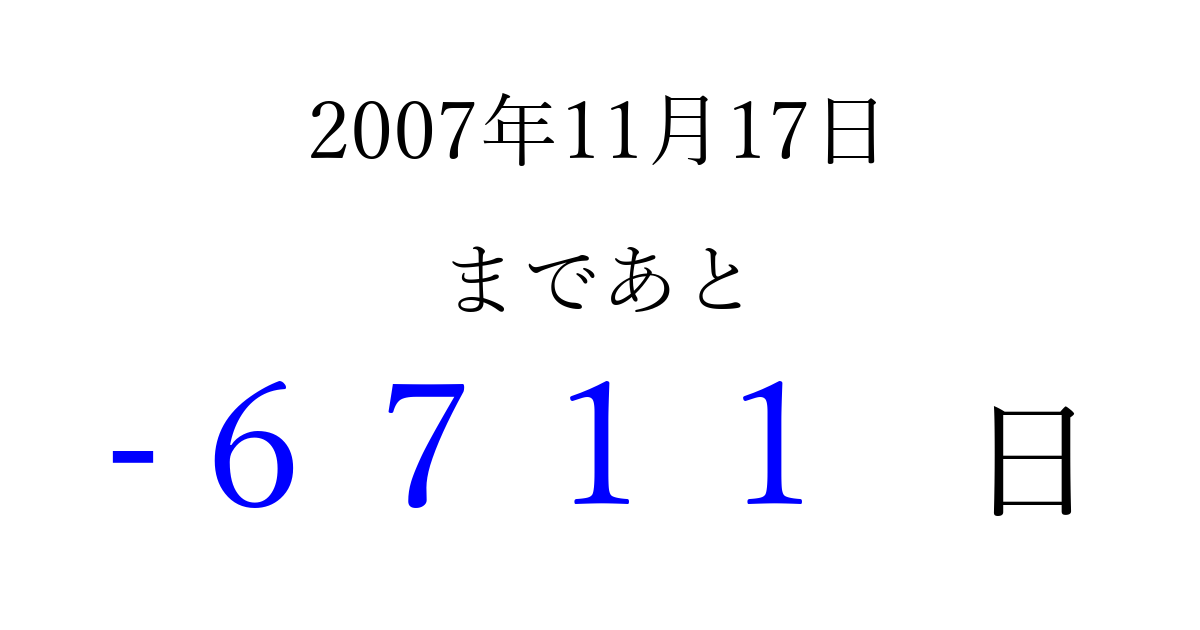 2007年11月17日(土)は もう 0000 日過ぎました 追加すると、トップページからすぐ選べるようになります ※2026/04/02現在の結果です。 最新の状態に更新する ↓シェアして、タイムライン上にカウントダウンを表示しよう!↓ 📤 この結果を共有する Tweet シェア Threads Bluesky 別の日付でカウントダウン 2007年11月のカレンダー このページをブックマークに追加すると、いつでもカウントダウンを確認できます。 (PC: Ctrl+D / Mac: ⌘+D) hitome-notes.comでは以下のページも運営しています。 指定日と期間から日付を計算 | ガチャ確率計算・シミュレーション | プライバシー・ポリシー 運営者:Avocado