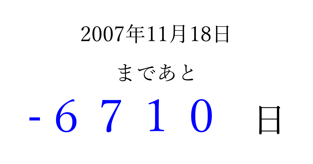 2007年11月18日(日)は もう 0000 日過ぎました 追加すると、トップページからすぐ選べるようになります ※2026/04/02現在の結果です。 最新の状態に更新する ↓シェアして、タイムライン上にカウントダウンを表示しよう!↓ 📤 この結果を共有する Tweet シェア Threads Bluesky 別の日付でカウントダウン 2007年11月のカレンダー このページをブックマークに追加すると、いつでもカウントダウンを確認できます。 (PC: Ctrl+D / Mac: ⌘+D) hitome-notes.comでは以下のページも運営しています。 指定日と期間から日付を計算 | ガチャ確率計算・シミュレーション | プライバシー・ポリシー 運営者:Avocado