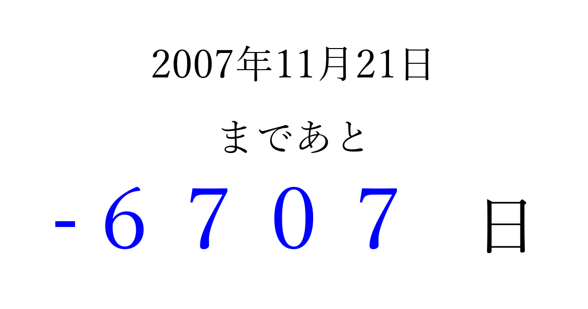 2007年11月21日(水)は もう 0000 日過ぎました 追加すると、トップページからすぐ選べるようになります ※2026/04/02現在の結果です。 最新の状態に更新する ↓シェアして、タイムライン上にカウントダウンを表示しよう!↓ 📤 この結果を共有する Tweet シェア Threads Bluesky 別の日付でカウントダウン 2007年11月のカレンダー このページをブックマークに追加すると、いつでもカウントダウンを確認できます。 (PC: Ctrl+D / Mac: ⌘+D) hitome-notes.comでは以下のページも運営しています。 指定日と期間から日付を計算 | ガチャ確率計算・シミュレーション | プライバシー・ポリシー 運営者:Avocado