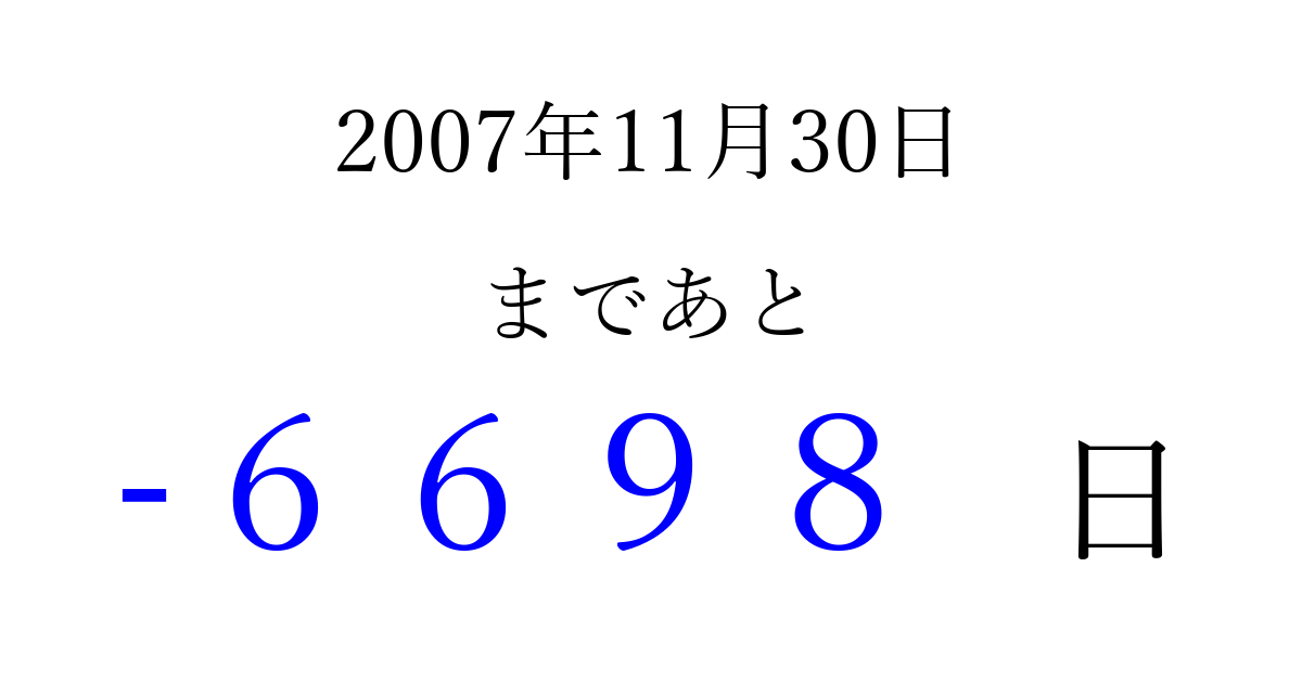 2007年11月30日(金)は もう 0000 日過ぎました 追加すると、トップページからすぐ選べるようになります ※2026/04/02現在の結果です。 最新の状態に更新する ↓シェアして、タイムライン上にカウントダウンを表示しよう!↓ 📤 この結果を共有する Tweet シェア Threads Bluesky 別の日付でカウントダウン 2007年11月のカレンダー このページをブックマークに追加すると、いつでもカウントダウンを確認できます。 (PC: Ctrl+D / Mac: ⌘+D) hitome-notes.comでは以下のページも運営しています。 指定日と期間から日付を計算 | ガチャ確率計算・シミュレーション | プライバシー・ポリシー 運営者:Avocado