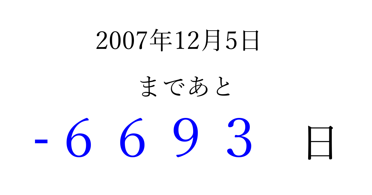 2007年12月5日(水)は もう 0000 日過ぎました 追加すると、トップページからすぐ選べるようになります ※2026/04/02現在の結果です。 最新の状態に更新する ↓シェアして、タイムライン上にカウントダウンを表示しよう!↓ 📤 この結果を共有する Tweet シェア Threads Bluesky 別の日付でカウントダウン 2007年12月のカレンダー このページをブックマークに追加すると、いつでもカウントダウンを確認できます。 (PC: Ctrl+D / Mac: ⌘+D) hitome-notes.comでは以下のページも運営しています。 指定日と期間から日付を計算 | ガチャ確率計算・シミュレーション | プライバシー・ポリシー 運営者:Avocado