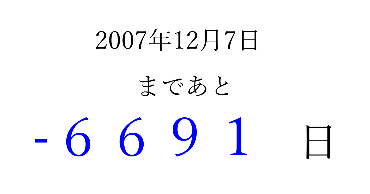 2007年12月7日(金)は もう 0000 日過ぎました 追加すると、トップページからすぐ選べるようになります ※2026/04/02現在の結果です。 最新の状態に更新する ↓シェアして、タイムライン上にカウントダウンを表示しよう!↓ 📤 この結果を共有する Tweet シェア Threads Bluesky 別の日付でカウントダウン 2007年12月のカレンダー このページをブックマークに追加すると、いつでもカウントダウンを確認できます。 (PC: Ctrl+D / Mac: ⌘+D) hitome-notes.comでは以下のページも運営しています。 指定日と期間から日付を計算 | ガチャ確率計算・シミュレーション | プライバシー・ポリシー 運営者:Avocado
