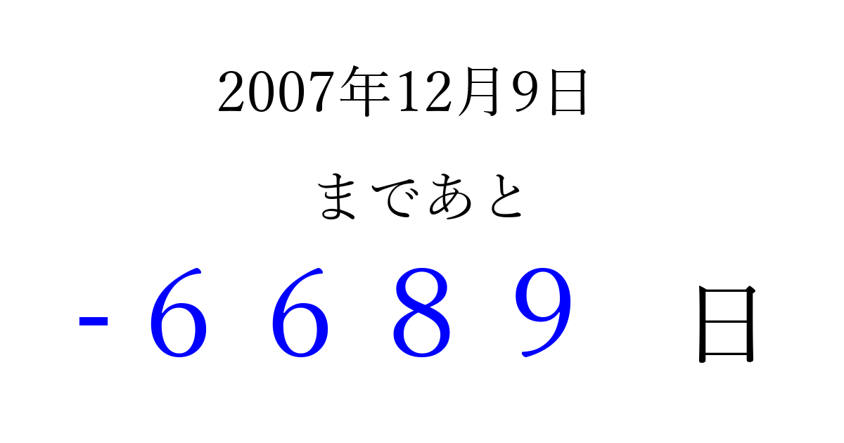 2007年12月9日(日)は もう 0000 日過ぎました 追加すると、トップページからすぐ選べるようになります ※2026/04/02現在の結果です。 最新の状態に更新する ↓シェアして、タイムライン上にカウントダウンを表示しよう!↓ 📤 この結果を共有する Tweet シェア Threads Bluesky 別の日付でカウントダウン 2007年12月のカレンダー このページをブックマークに追加すると、いつでもカウントダウンを確認できます。 (PC: Ctrl+D / Mac: ⌘+D) hitome-notes.comでは以下のページも運営しています。 指定日と期間から日付を計算 | ガチャ確率計算・シミュレーション | プライバシー・ポリシー 運営者:Avocado