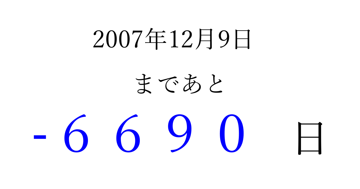2007年12月9日(日)は もう 0000 日過ぎました 追加すると、トップページからすぐ選べるようになります ※2026/04/03現在の結果です。 最新の状態に更新する ↓シェアして、タイムライン上にカウントダウンを表示しよう!↓ 📤 この結果を共有する Tweet シェア Threads Bluesky 別の日付でカウントダウン 2007年12月のカレンダー このページをブックマークに追加すると、いつでもカウントダウンを確認できます。 (PC: Ctrl+D / Mac: ⌘+D) hitome-notes.comでは以下のページも運営しています。 指定日と期間から日付を計算 | ガチャ確率計算・シミュレーション | プライバシー・ポリシー 運営者:Avocado