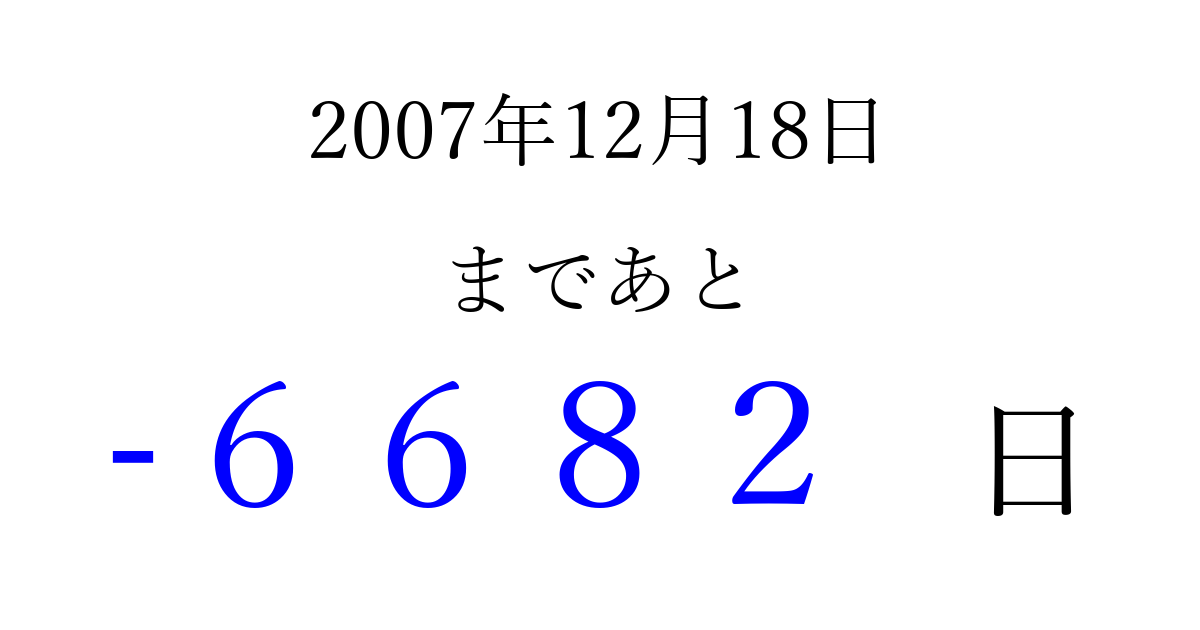 2007年12月18日(火)は もう 0000 日過ぎました 追加すると、トップページからすぐ選べるようになります ※2026/04/04現在の結果です。 最新の状態に更新する ↓シェアして、タイムライン上にカウントダウンを表示しよう!↓ 📤 この結果を共有する Tweet シェア Threads Bluesky 別の日付でカウントダウン 2007年12月のカレンダー このページをブックマークに追加すると、いつでもカウントダウンを確認できます。 (PC: Ctrl+D / Mac: ⌘+D) hitome-notes.comでは以下のページも運営しています。 指定日と期間から日付を計算 | ガチャ確率計算・シミュレーション | プライバシー・ポリシー 運営者:Avocado