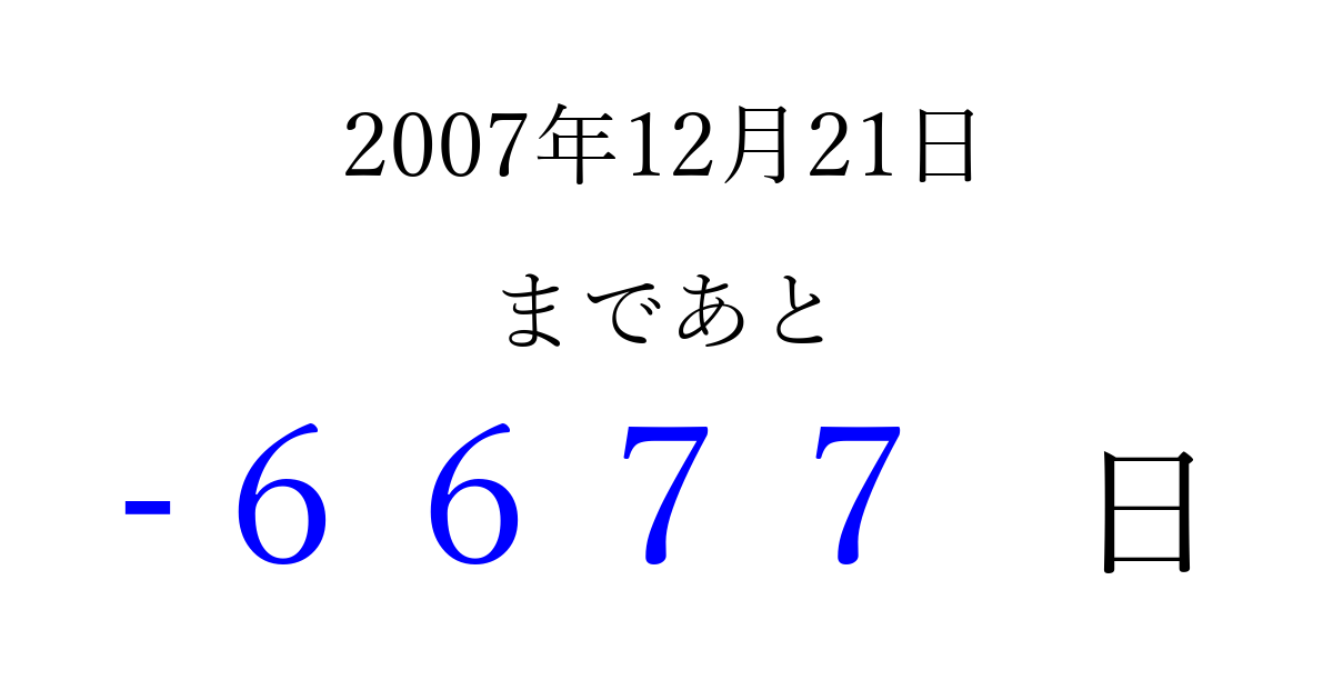2007年12月21日(金)は もう 0000 日過ぎました 追加すると、トップページからすぐ選べるようになります ※2026/04/02現在の結果です。 最新の状態に更新する ↓シェアして、タイムライン上にカウントダウンを表示しよう!↓ 📤 この結果を共有する Tweet シェア Threads Bluesky 別の日付でカウントダウン 2007年12月のカレンダー このページをブックマークに追加すると、いつでもカウントダウンを確認できます。 (PC: Ctrl+D / Mac: ⌘+D) hitome-notes.comでは以下のページも運営しています。 指定日と期間から日付を計算 | ガチャ確率計算・シミュレーション | プライバシー・ポリシー 運営者:Avocado