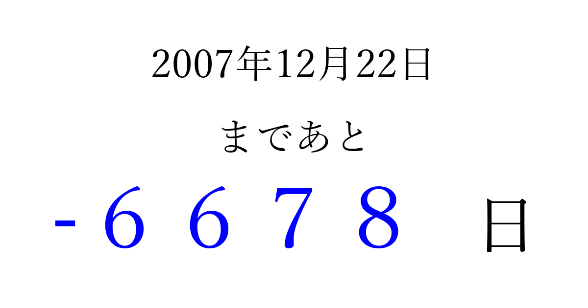2007年12月22日(土)は もう 0000 日過ぎました 追加すると、トップページからすぐ選べるようになります ※2026/04/04現在の結果です。 最新の状態に更新する ↓シェアして、タイムライン上にカウントダウンを表示しよう!↓ 📤 この結果を共有する Tweet シェア Threads Bluesky 別の日付でカウントダウン 2007年12月のカレンダー このページをブックマークに追加すると、いつでもカウントダウンを確認できます。 (PC: Ctrl+D / Mac: ⌘+D) hitome-notes.comでは以下のページも運営しています。 指定日と期間から日付を計算 | ガチャ確率計算・シミュレーション | プライバシー・ポリシー 運営者:Avocado