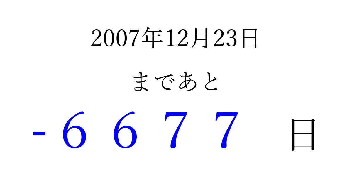 2007年12月23日(日)は もう 0000 日過ぎました 追加すると、トップページからすぐ選べるようになります ※2026/04/04現在の結果です。 最新の状態に更新する ↓シェアして、タイムライン上にカウントダウンを表示しよう!↓ 📤 この結果を共有する Tweet シェア Threads Bluesky 別の日付でカウントダウン 2007年12月のカレンダー このページをブックマークに追加すると、いつでもカウントダウンを確認できます。 (PC: Ctrl+D / Mac: ⌘+D) hitome-notes.comでは以下のページも運営しています。 指定日と期間から日付を計算 | ガチャ確率計算・シミュレーション | プライバシー・ポリシー 運営者:Avocado