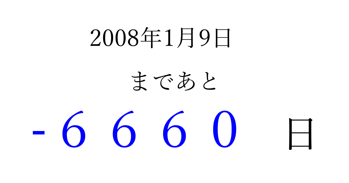 2008年1月9日(水)は もう 0000 日過ぎました 追加すると、トップページからすぐ選べるようになります ※2026/04/04現在の結果です。 最新の状態に更新する ↓シェアして、タイムライン上にカウントダウンを表示しよう!↓ 📤 この結果を共有する Tweet シェア Threads Bluesky 別の日付でカウントダウン 2008年1月のカレンダー このページをブックマークに追加すると、いつでもカウントダウンを確認できます。 (PC: Ctrl+D / Mac: ⌘+D) hitome-notes.comでは以下のページも運営しています。 指定日と期間から日付を計算 | ガチャ確率計算・シミュレーション | プライバシー・ポリシー 運営者:Avocado
