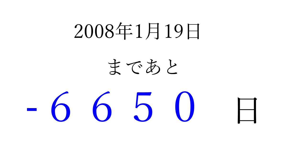 2008年1月19日(土)は もう 0000 日過ぎました 追加すると、トップページからすぐ選べるようになります ※2026/04/04現在の結果です。 最新の状態に更新する ↓シェアして、タイムライン上にカウントダウンを表示しよう!↓ 📤 この結果を共有する Tweet シェア Threads Bluesky 別の日付でカウントダウン 2008年1月のカレンダー このページをブックマークに追加すると、いつでもカウントダウンを確認できます。 (PC: Ctrl+D / Mac: ⌘+D) hitome-notes.comでは以下のページも運営しています。 指定日と期間から日付を計算 | ガチャ確率計算・シミュレーション | プライバシー・ポリシー 運営者:Avocado