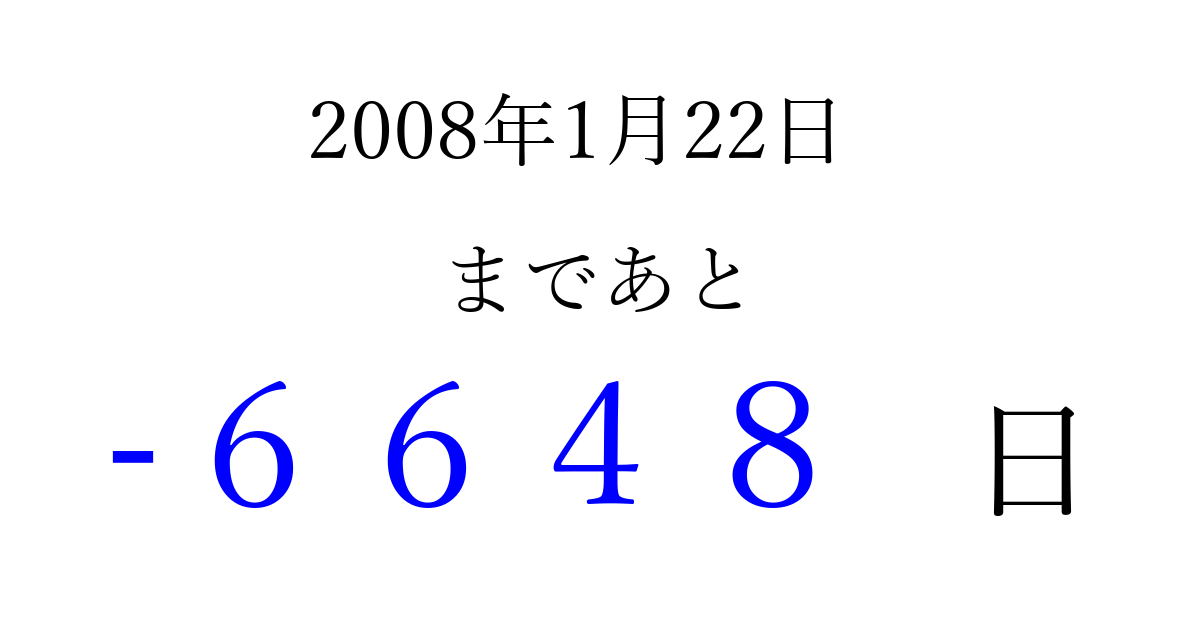 2008年1月22日(火)は もう 0000 日過ぎました 追加すると、トップページからすぐ選べるようになります ※2026/04/05現在の結果です。 最新の状態に更新する ↓シェアして、タイムライン上にカウントダウンを表示しよう!↓ 📤 この結果を共有する Tweet シェア Threads Bluesky 別の日付でカウントダウン 2008年1月のカレンダー このページをブックマークに追加すると、いつでもカウントダウンを確認できます。 (PC: Ctrl+D / Mac: ⌘+D) hitome-notes.comでは以下のページも運営しています。 指定日と期間から日付を計算 | ガチャ確率計算・シミュレーション | プライバシー・ポリシー 運営者:Avocado