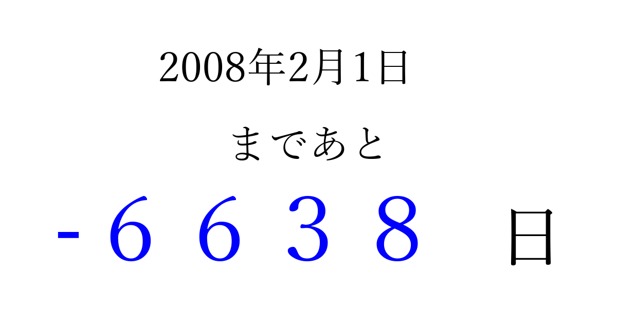 2008年2月1日(金)は もう 0000 日過ぎました 追加すると、トップページからすぐ選べるようになります ※2026/04/05現在の結果です。 最新の状態に更新する ↓シェアして、タイムライン上にカウントダウンを表示しよう!↓ 📤 この結果を共有する Tweet シェア Threads Bluesky 別の日付でカウントダウン 2008年2月のカレンダー このページをブックマークに追加すると、いつでもカウントダウンを確認できます。 (PC: Ctrl+D / Mac: ⌘+D) hitome-notes.comでは以下のページも運営しています。 指定日と期間から日付を計算 | ガチャ確率計算・シミュレーション | プライバシー・ポリシー 運営者:Avocado