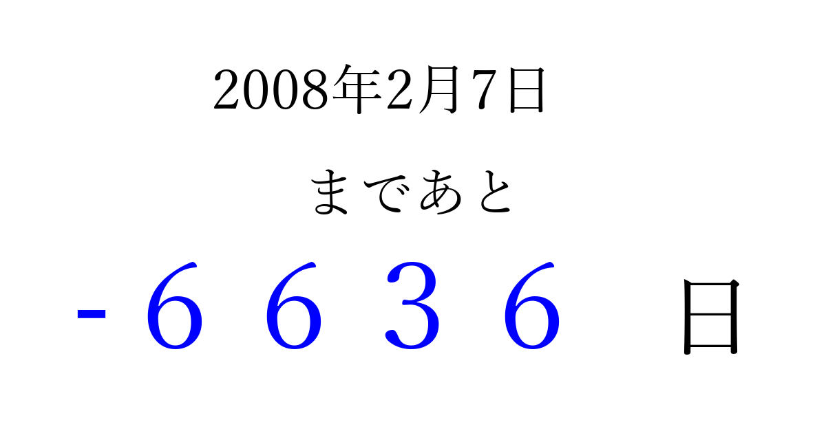2008年2月7日(木)は もう 0000 日過ぎました 追加すると、トップページからすぐ選べるようになります ※2026/04/09現在の結果です。 最新の状態に更新する ↓シェアして、タイムライン上にカウントダウンを表示しよう!↓ 📤 この結果を共有する Tweet シェア Threads Bluesky 別の日付でカウントダウン 2008年2月のカレンダー このページをブックマークに追加すると、いつでもカウントダウンを確認できます。 (PC: Ctrl+D / Mac: ⌘+D) hitome-notes.comでは以下のページも運営しています。 指定日と期間から日付を計算 | ガチャ確率計算・シミュレーション | プライバシー・ポリシー 運営者:Avocado