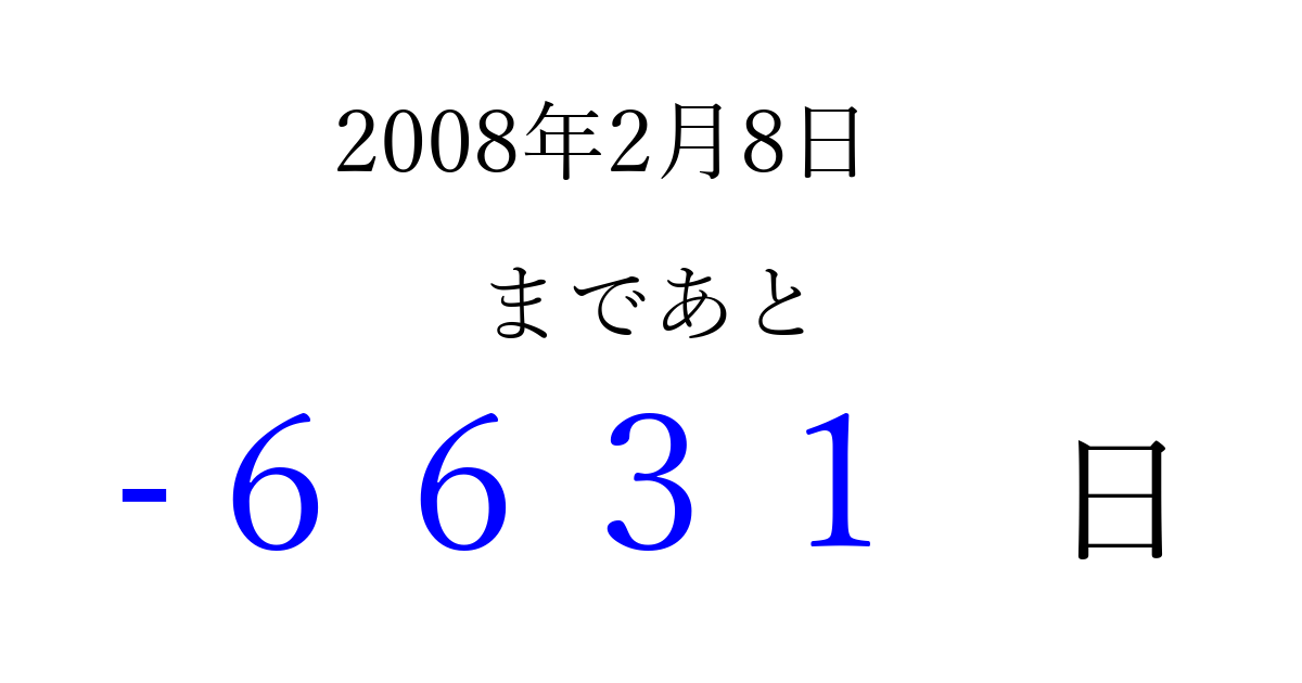 2008年2月8日(金)は もう 0000 日過ぎました 追加すると、トップページからすぐ選べるようになります ※2026/04/05現在の結果です。 最新の状態に更新する ↓シェアして、タイムライン上にカウントダウンを表示しよう!↓ 📤 この結果を共有する Tweet シェア Threads Bluesky 別の日付でカウントダウン 2008年2月のカレンダー このページをブックマークに追加すると、いつでもカウントダウンを確認できます。 (PC: Ctrl+D / Mac: ⌘+D) hitome-notes.comでは以下のページも運営しています。 指定日と期間から日付を計算 | ガチャ確率計算・シミュレーション | プライバシー・ポリシー 運営者:Avocado