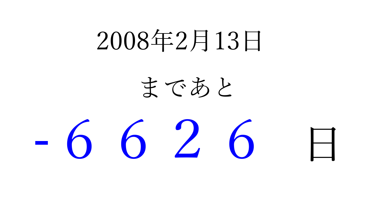 2008年2月13日(水)は もう 0000 日過ぎました 追加すると、トップページからすぐ選べるようになります ※2026/04/05現在の結果です。 最新の状態に更新する ↓シェアして、タイムライン上にカウントダウンを表示しよう!↓ 📤 この結果を共有する Tweet シェア Threads Bluesky 別の日付でカウントダウン 2008年2月のカレンダー このページをブックマークに追加すると、いつでもカウントダウンを確認できます。 (PC: Ctrl+D / Mac: ⌘+D) hitome-notes.comでは以下のページも運営しています。 指定日と期間から日付を計算 | ガチャ確率計算・シミュレーション | プライバシー・ポリシー 運営者:Avocado