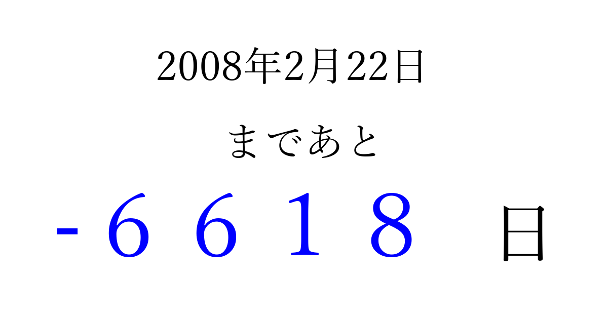 2008年2月22日(金)は もう 0000 日過ぎました 追加すると、トップページからすぐ選べるようになります ※2026/04/06現在の結果です。 最新の状態に更新する ↓シェアして、タイムライン上にカウントダウンを表示しよう!↓ 📤 この結果を共有する Tweet シェア Threads Bluesky 別の日付でカウントダウン 2008年2月のカレンダー このページをブックマークに追加すると、いつでもカウントダウンを確認できます。 (PC: Ctrl+D / Mac: ⌘+D) hitome-notes.comでは以下のページも運営しています。 指定日と期間から日付を計算 | ガチャ確率計算・シミュレーション | プライバシー・ポリシー 運営者:Avocado