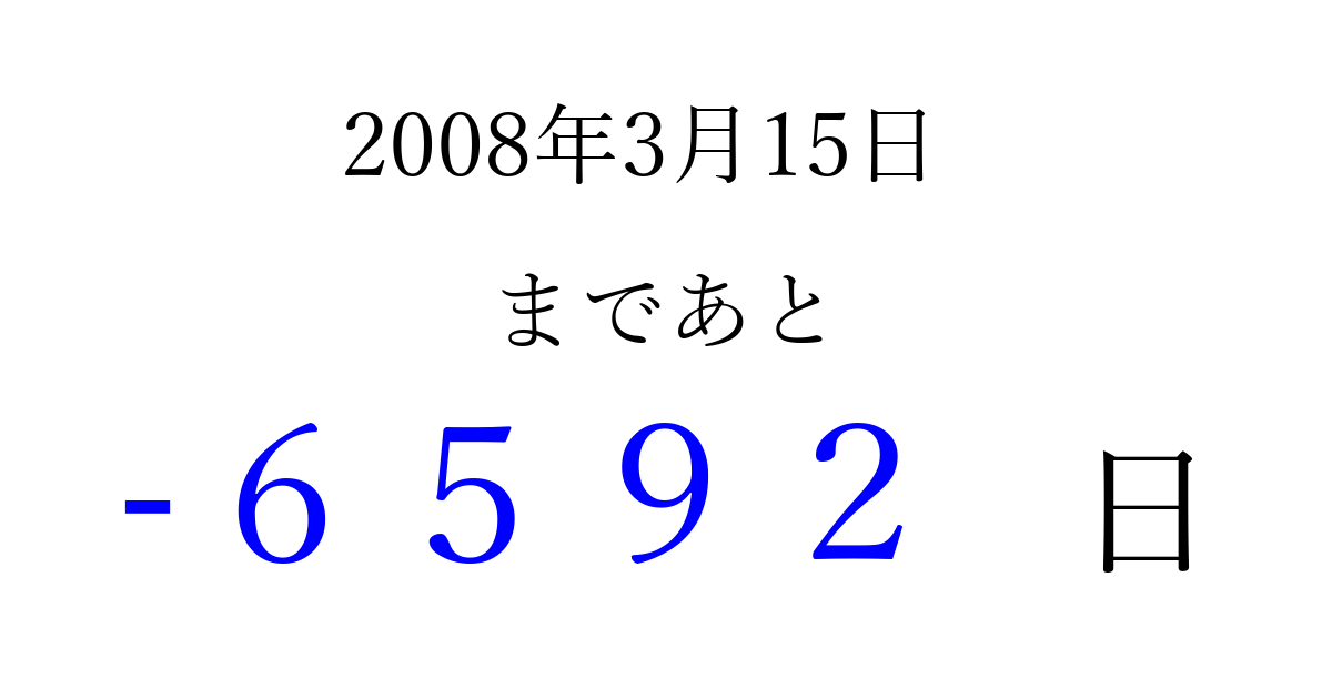 2008年3月15日(土)は もう 0000 日過ぎました 追加すると、トップページからすぐ選べるようになります ※2026/04/02現在の結果です。 最新の状態に更新する ↓シェアして、タイムライン上にカウントダウンを表示しよう!↓ 📤 この結果を共有する Tweet シェア Threads Bluesky 別の日付でカウントダウン 2008年3月のカレンダー このページをブックマークに追加すると、いつでもカウントダウンを確認できます。 (PC: Ctrl+D / Mac: ⌘+D) hitome-notes.comでは以下のページも運営しています。 指定日と期間から日付を計算 | ガチャ確率計算・シミュレーション | プライバシー・ポリシー 運営者:Avocado