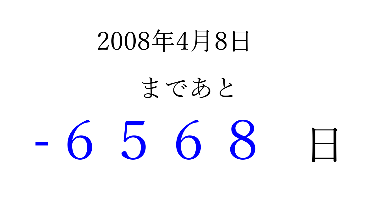 2008年4月8日(火)は もう 0000 日過ぎました 追加すると、トップページからすぐ選べるようになります ※2026/04/02現在の結果です。 最新の状態に更新する ↓シェアして、タイムライン上にカウントダウンを表示しよう!↓ 📤 この結果を共有する Tweet シェア Threads Bluesky 別の日付でカウントダウン 2008年4月のカレンダー このページをブックマークに追加すると、いつでもカウントダウンを確認できます。 (PC: Ctrl+D / Mac: ⌘+D) hitome-notes.comでは以下のページも運営しています。 指定日と期間から日付を計算 | ガチャ確率計算・シミュレーション | プライバシー・ポリシー 運営者:Avocado