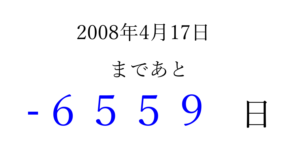 2008年4月17日(木)は もう 0000 日過ぎました 追加すると、トップページからすぐ選べるようになります ※2026/04/02現在の結果です。 最新の状態に更新する ↓シェアして、タイムライン上にカウントダウンを表示しよう!↓ 📤 この結果を共有する Tweet シェア Threads Bluesky 別の日付でカウントダウン 2008年4月のカレンダー このページをブックマークに追加すると、いつでもカウントダウンを確認できます。 (PC: Ctrl+D / Mac: ⌘+D) hitome-notes.comでは以下のページも運営しています。 指定日と期間から日付を計算 | ガチャ確率計算・シミュレーション | プライバシー・ポリシー 運営者:Avocado