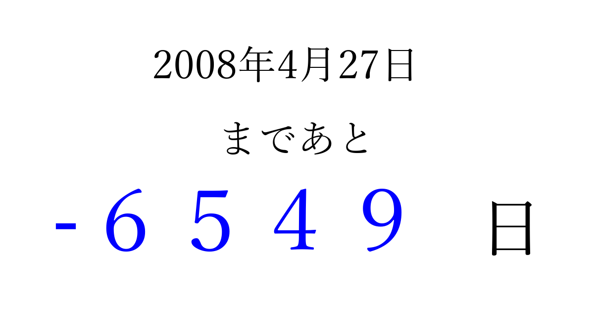 2008年4月27日(日)は もう 0000 日過ぎました 追加すると、トップページからすぐ選べるようになります ※2026/04/02現在の結果です。 最新の状態に更新する ↓シェアして、タイムライン上にカウントダウンを表示しよう!↓ 📤 この結果を共有する Tweet シェア Threads Bluesky 別の日付でカウントダウン 2008年4月のカレンダー このページをブックマークに追加すると、いつでもカウントダウンを確認できます。 (PC: Ctrl+D / Mac: ⌘+D) hitome-notes.comでは以下のページも運営しています。 指定日と期間から日付を計算 | ガチャ確率計算・シミュレーション | プライバシー・ポリシー 運営者:Avocado