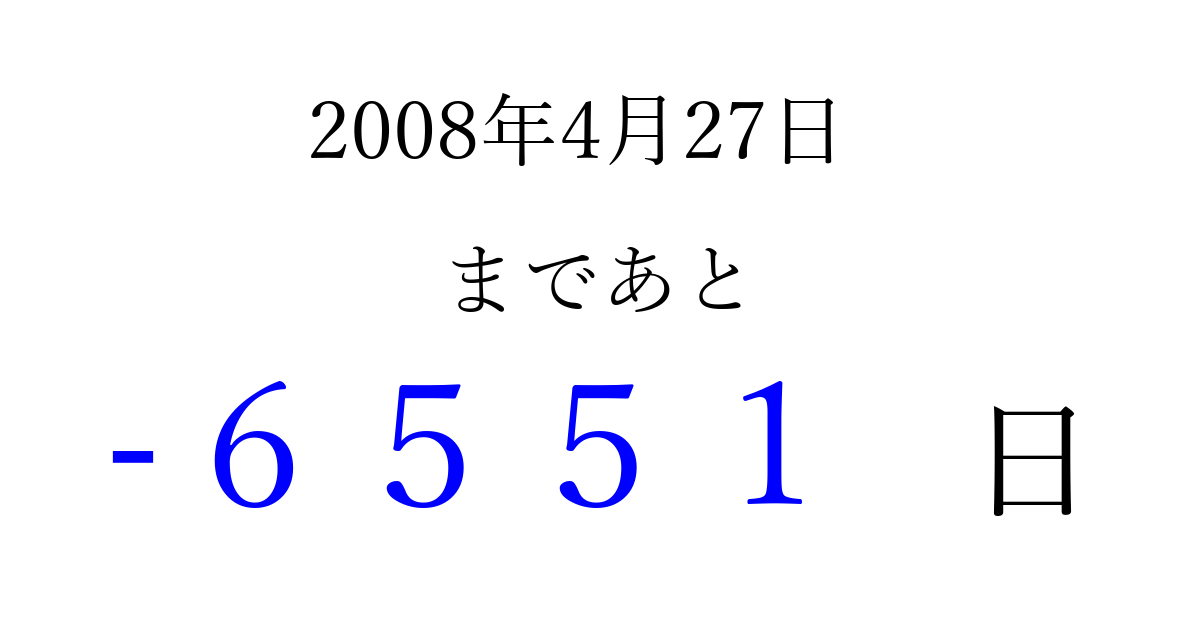 2008年4月27日(日)は もう 0000 日過ぎました 追加すると、トップページからすぐ選べるようになります ※2026/04/04現在の結果です。 最新の状態に更新する ↓シェアして、タイムライン上にカウントダウンを表示しよう!↓ 📤 この結果を共有する Tweet シェア Threads Bluesky 別の日付でカウントダウン 2008年4月のカレンダー このページをブックマークに追加すると、いつでもカウントダウンを確認できます。 (PC: Ctrl+D / Mac: ⌘+D) hitome-notes.comでは以下のページも運営しています。 指定日と期間から日付を計算 | ガチャ確率計算・シミュレーション | プライバシー・ポリシー 運営者:Avocado