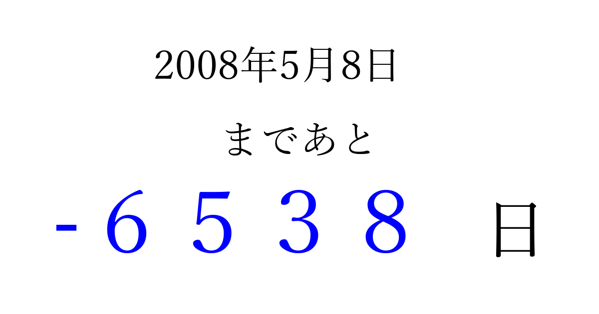 2008年5月8日(木)は もう 0000 日過ぎました 追加すると、トップページからすぐ選べるようになります ※2026/04/02現在の結果です。 最新の状態に更新する ↓シェアして、タイムライン上にカウントダウンを表示しよう!↓ 📤 この結果を共有する Tweet シェア Threads Bluesky 別の日付でカウントダウン 2008年5月のカレンダー このページをブックマークに追加すると、いつでもカウントダウンを確認できます。 (PC: Ctrl+D / Mac: ⌘+D) hitome-notes.comでは以下のページも運営しています。 指定日と期間から日付を計算 | ガチャ確率計算・シミュレーション | プライバシー・ポリシー 運営者:Avocado